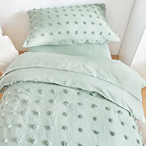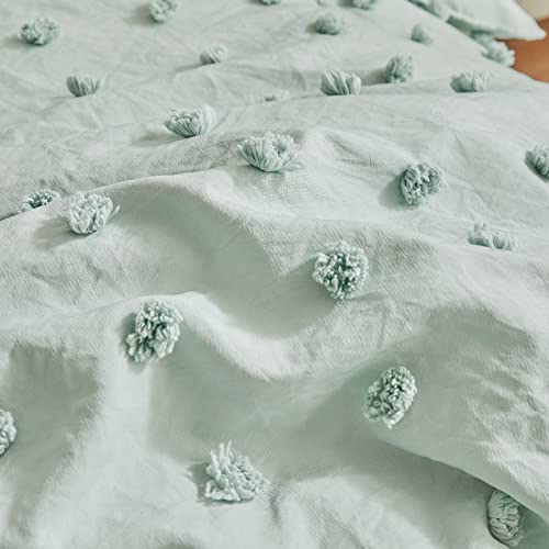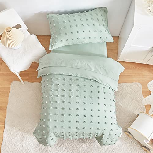 4 Piece Tufted Dots Toddler Bedding Set Solid Green Jacquard Pom Pom Tufts, Soft and Embroidery Shabby Chic Boho Design for Baby Boys Girls, Includes Comforter, Flat Sheet, Fitted Sheet and Pillowcase