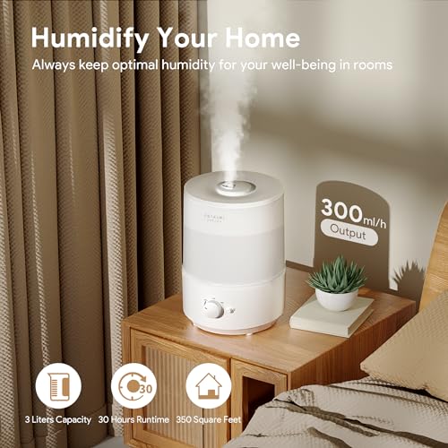 Extended Humidification with Mega Capacity: The humidifier runs for up to 30 hours on low with its 3-liter large-capacity water tank. It efficiently humidifies with up to 300 ml/h output, ensuring your space remains comfortable, and helping you combat congestion, coughing, and dry skin. Ideal for bedrooms, kids’ rooms, offices, and indoor plants.