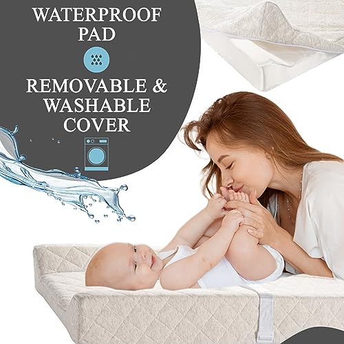 Organic Cotton Contoured Baby Changing Pad w/Waterproof Foam Mattress, Includes Soft, Removable & Washable Cover, Safety Strap, Non-Slip Bottom, Topper for Standard Size Infant Diaper Table & Dresser